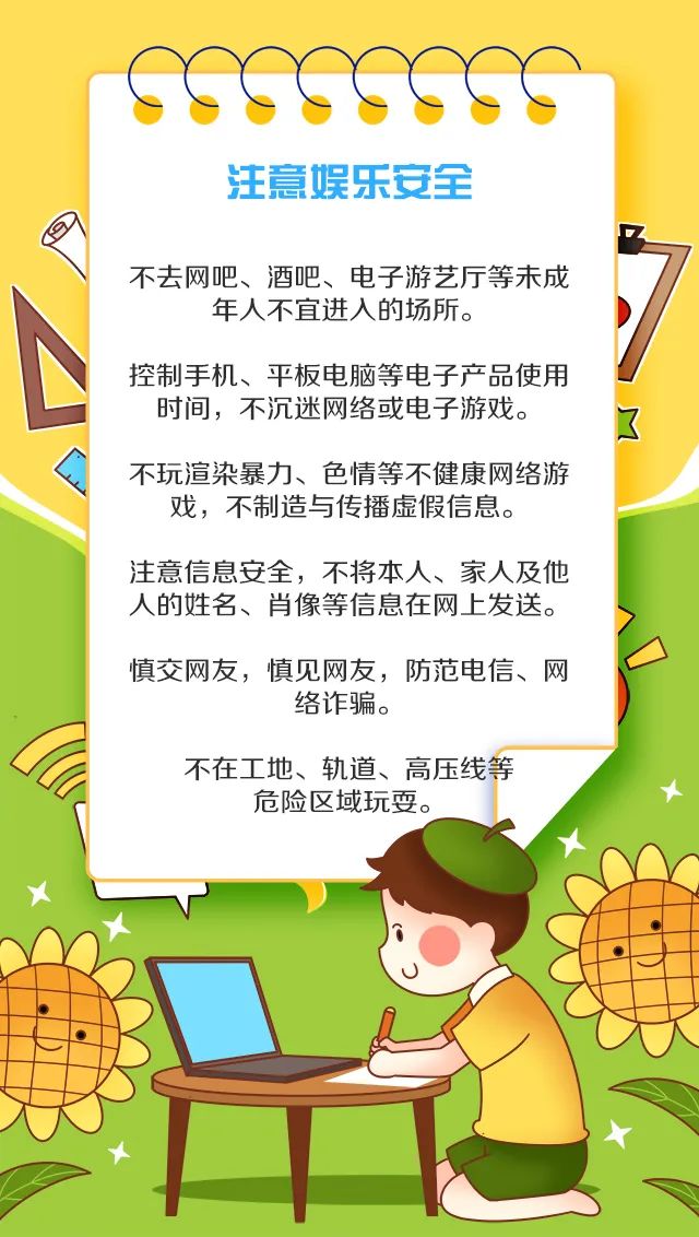 不经意间,暑假悄然而至。在享受愉快假期的同时,也不能忽视对孩子的安全防护,本篇总结中小学暑期安全提示42条,涵盖疫情防控、交通安全、预防溺水、居家安全、旅游安全、娱乐安全、心理安全七个方面,一起牢记,守护孩子的假期安全吧!