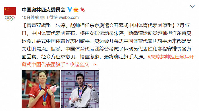 7月17日晚,中国体育代表团宣布,将由女排运动员朱婷、跆拳道运动员赵帅担任东京奥运会开幕式中国体育代表团旗手。奥运会开幕式中国体育代表团旗手历来都是受关注的焦点。据悉,中国体育代表团综合考虑了运动员代表性和赛程安排等各方面因素,经多方征求意见、慎重考虑,最终确定旗手人选。