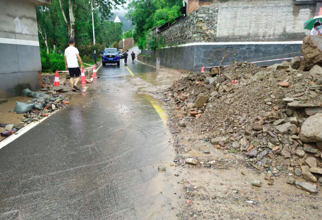 众多点位中,军庄镇东山村降雨量达160毫米,全镇范围内接连出现10余处积水点、30多处墙体倒塌、排洪沟上游淤堵、山体滑坡等险情。根据实际情况,军庄镇率先启动防汛红色预警,积极进行防汛应急抢险。镇党委书记高建光顾不上更换雨衣雨鞋,第一时间到险情最严重的东山村进行现场督导,紧急组织60余名应急抢险人员,调配2台铲车、2辆钩机、2台水泵全力安排抢险。从7月18日上午5点20分到9点50分,转移东山村2户4人、救援群众30名、清除山石淤泥10车、放置防洪沙袋40包、疏通道路2000米,截至目前无一例人员伤亡,交通保持了顺畅。