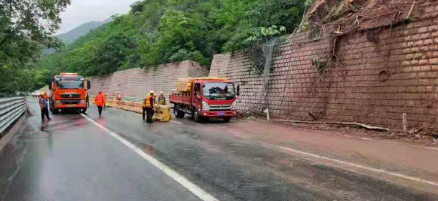 截至14时30分,滑坡路段上的落石已经清理干净,由于还需要对滑坡所在的边坡进行修复,养护人员正在堆放水马,临时封闭最内侧的超车道。经过首发养护公司紧急清障、修复和路面清洗,在封闭靠近山体超车道的基础上,于14点50分开放交通。