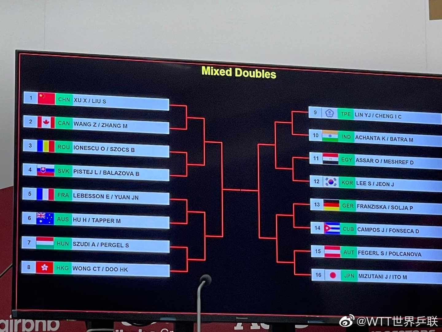 混双比赛中,许昕/刘诗雯首轮将对阵加拿大组合王瑧/张默,东道主组合水谷隼/伊藤美诚则将迎战奥地利组合费格尔/波尔卡诺娃。