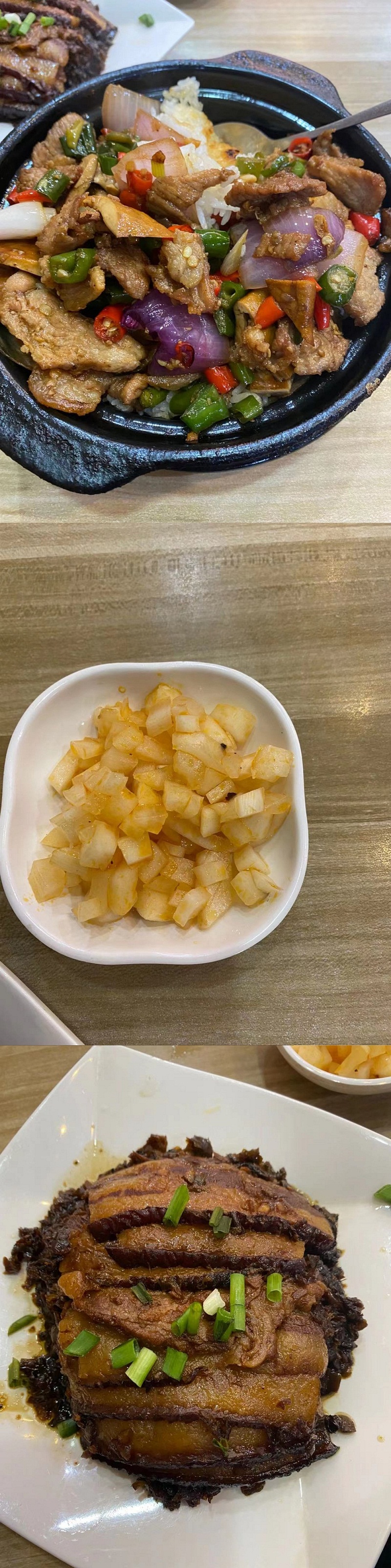 简单的一餐饭,老何最爱现场炒制的小炒肉锅巴饭,其次是自制泡菜,最不爱成品加热的咸烧白