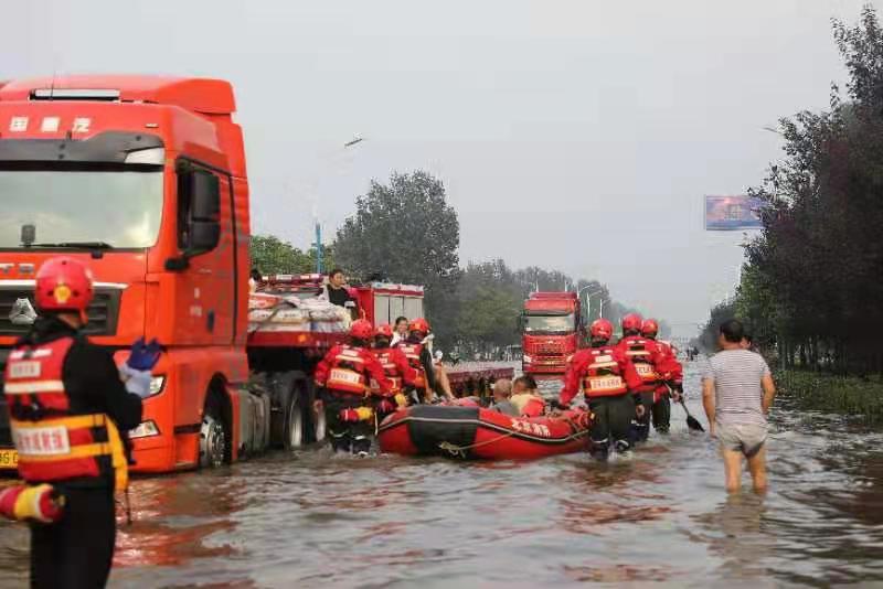 7月23日凌晨3时,北京消防集结出发,13时40分,抵达河南新乡市集合点,16时许,14艘舟艇、8辆车、88名指战员,利用消防越野车跨越城市内涝区域,赶往新乡市下辖的卫辉市。