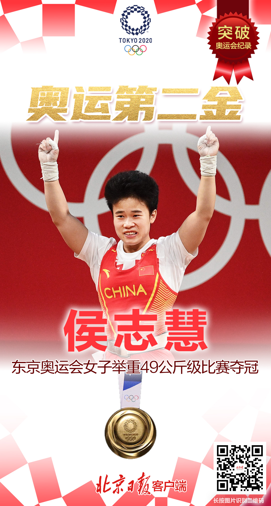中国第二金到手!侯志慧以210公斤的总成绩取得东京奥运会女子举重49公斤级冠军。侯志慧抓举94公斤,挺举116公斤,总成绩210公斤,三项全部创造奥运会纪录。
