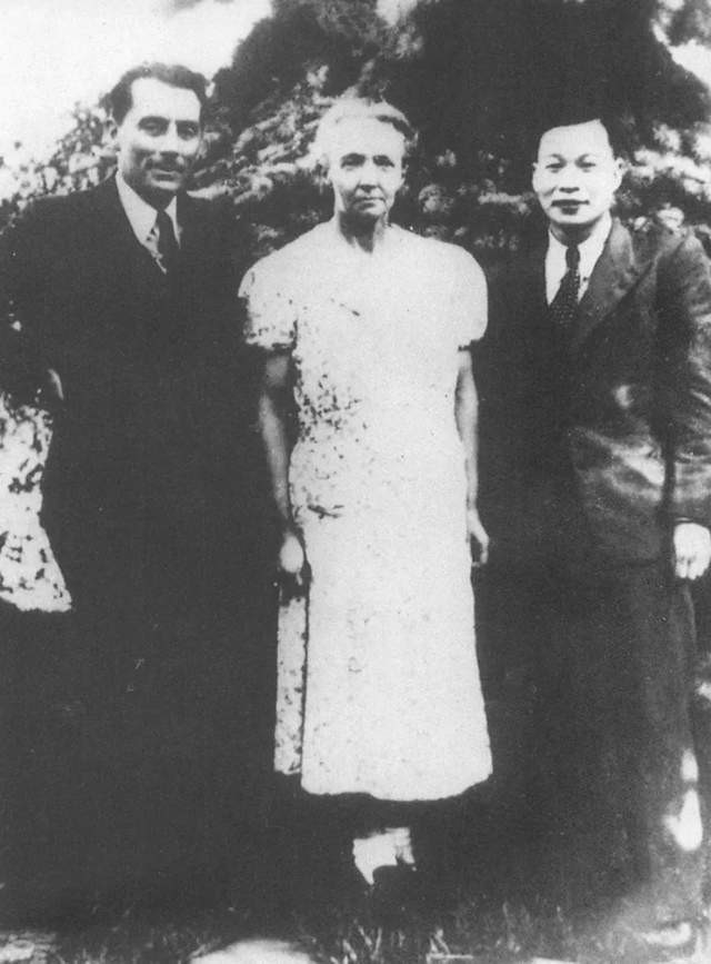 △1948年春,钱三强(右)回国前夕在巴黎与约里奥·居里夫妇合影