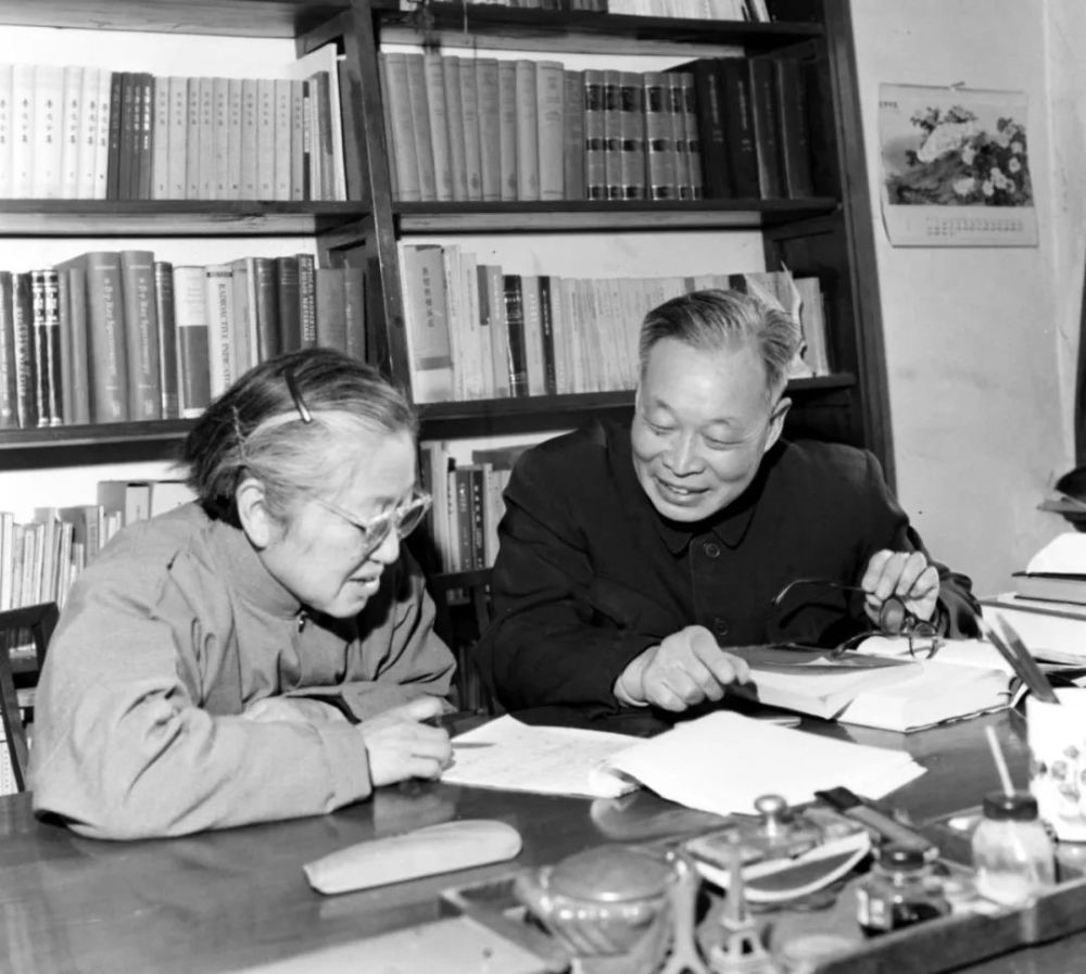 △女科学家何泽慧(左)和她的丈夫、科学家钱三强在一起研究有关学术问题