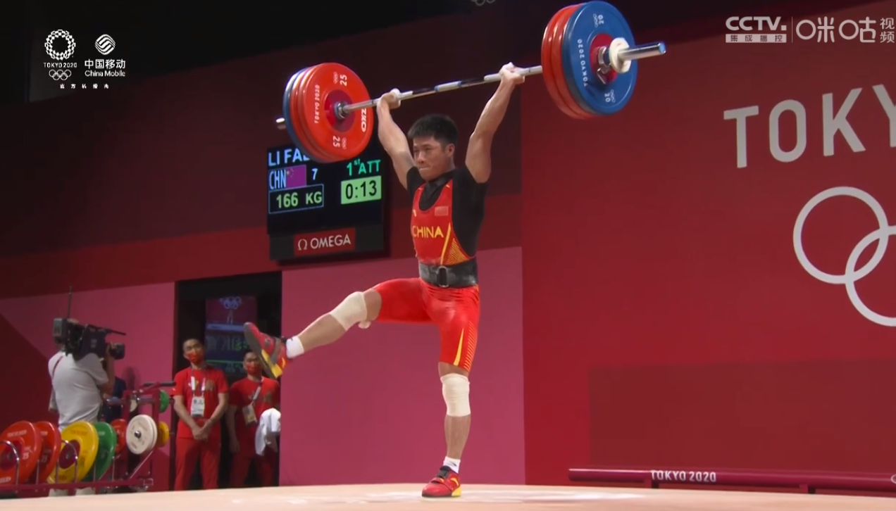在挺举比赛中,李发彬的第一次试举中发生了既危险又有意思的一幕,他在翻站完成随后上举的过程中,因为没有保持好平衡,重心侧向一边,整个人的重量压在了一条腿上,身体也呈现“金鸡独立”的姿态。不过,能力超强的李发彬很快调整好身体姿态,成功完成了这次试举,为接下来的夺冠打下了基础。