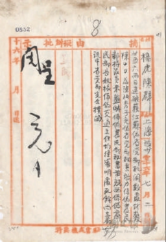 电报以韵目代日,“陷”即“三十日”。摘要件也写明此电于“陷卅”日发自上海,“十六年七月二日到”,“批示”栏有毛笔阅画。文中“陈□□”虽略去两字,显指陈延年无疑。7月2日,杨虎、陈群又发“冬”电,再次言明陈延年已死,并询问“线人”的赏款应如何领取发放: