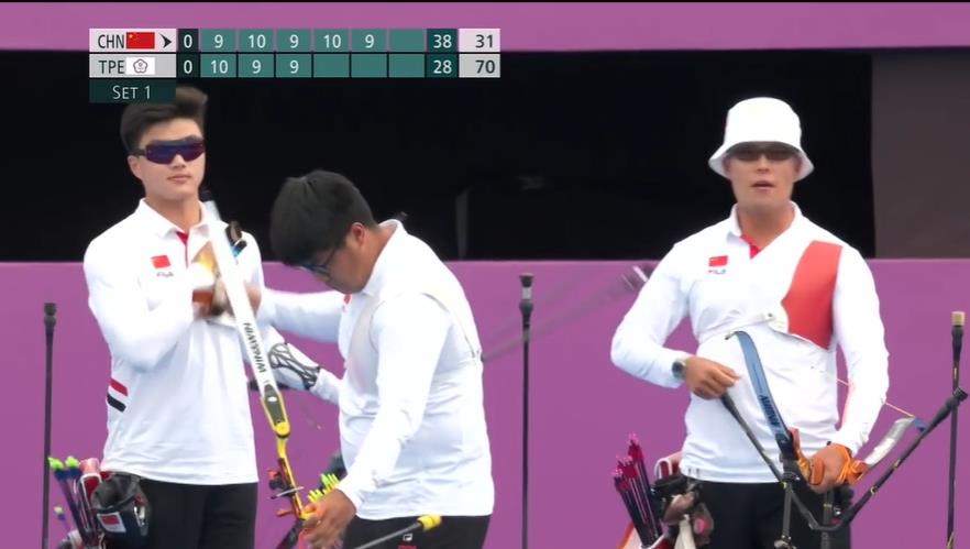 本场与中国台北队的较量,中国队开局状态不错,第一局6箭射出了55环的好成绩,但中国台北队手感同样火热,前6箭也拿下55环,首局两队战平,各取1分。次局,中国队前三箭失常,只射下23环,最终50比54落败,中国台北队拿到2分,以3比1领先。没有退路的第三局中,中国队在最后3箭射出10环、10环和9环的好成绩,总计拿下54环,但中国台北队更加出色,本局得到56分,再得2分,以总比分5比1拿下胜利。中国队遗憾败北,未能跻身四强。