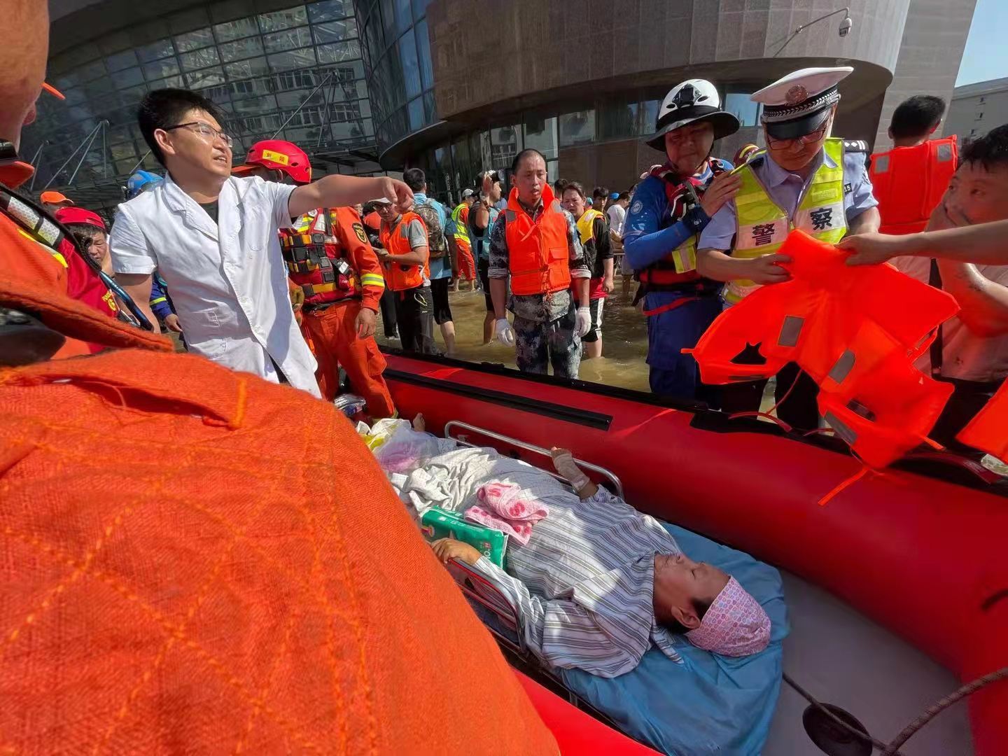 “船上的医护人员一定要照顾好老人。”一名消防员在积水中牵引舟艇前行,他再三叮嘱要注意老人身体状况。最终,老人被成功转运至安全区域。