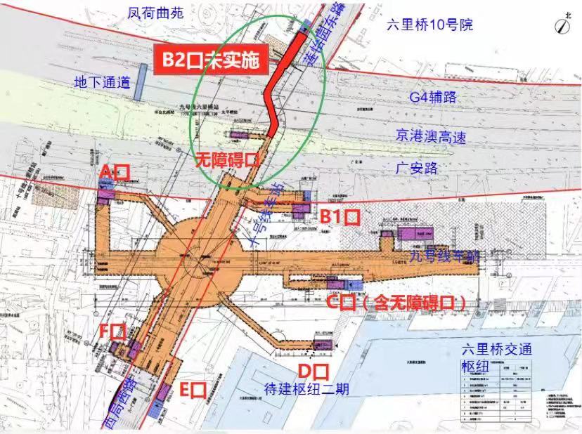六里桥站是北京地铁9号线与10号线的换乘车站,车站2011年就已经开通,7个地铁出入口中只有B2口“卡”了10年。这些地铁口中,有6个都在京港澳高速的南侧,只有B2口在北侧,但其实周边的居民并不少。
