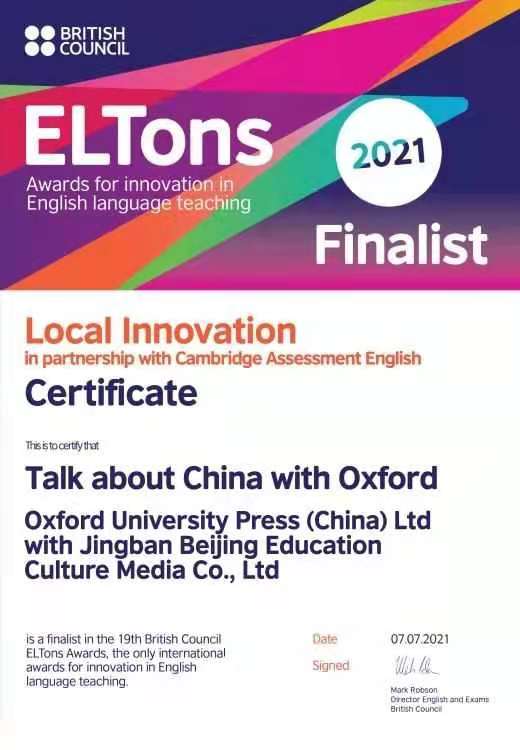 7月24日,由京版集团旗下北教传媒公司、北京教育出版社与牛津大学出版社(中国)有限公司联合编写、出版的《牛津英语话中国》系列图书,在来自全球50个国家和地区的180多个项目中脱颖而出,荣获ELTons国际英语教学创新奖2021年度本土教学创新奖提名奖。此次获奖是中国出版界首次获ELTons本土教学创新奖提名奖。