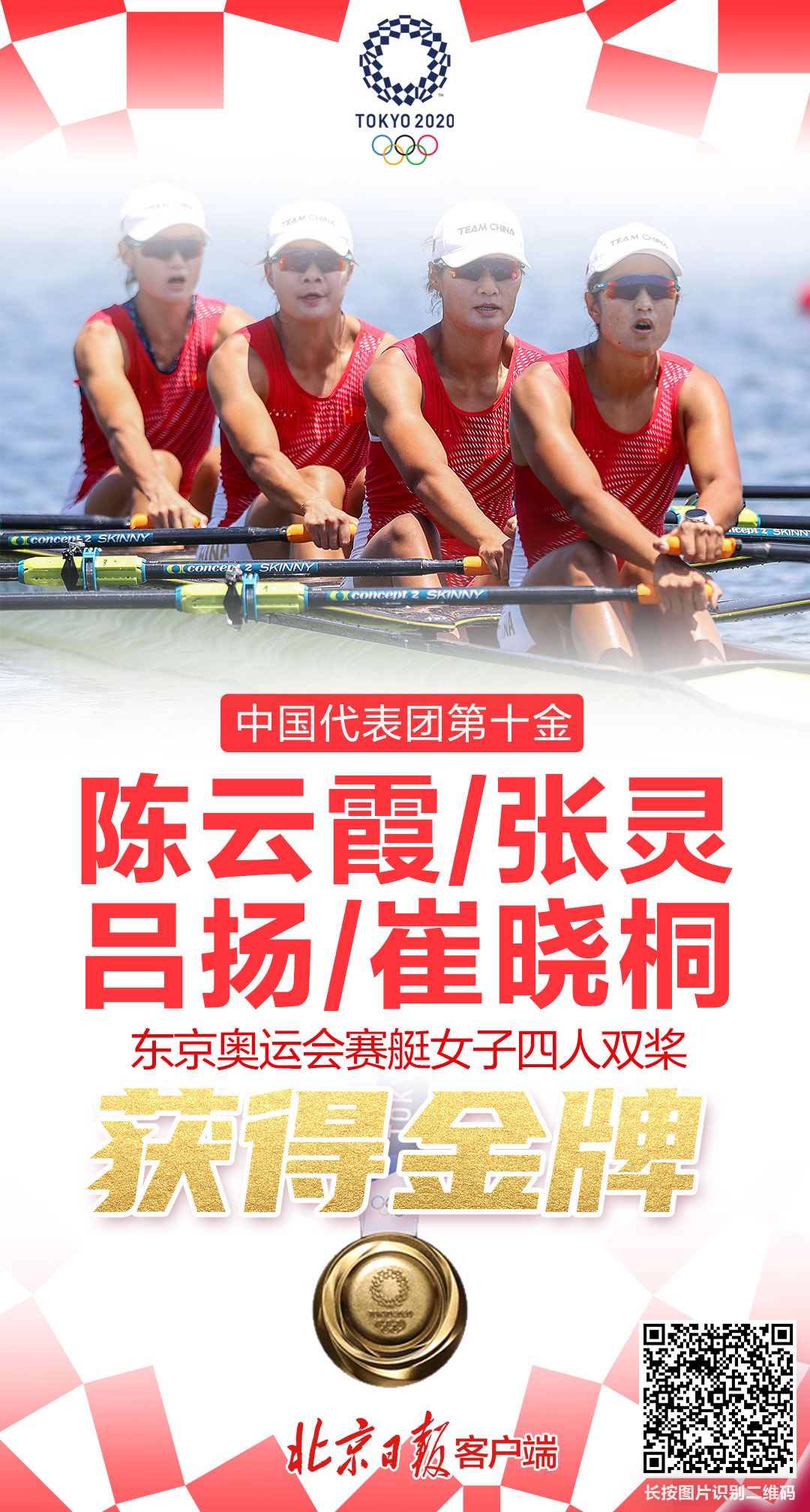 北京时间7月28日上午,中国赛艇女子四人双桨的四位姑娘陈云霞/张灵/吕扬/崔晓桐,从决赛出发开始即取得领先,她们的划水效率非常高,在其他决赛队伍桨频在40下以上时,她们可以低至39下,却仍可以不断拉开与对手的差距。她们从第三道出发,在比赛进行了1000米后,就已经领先第二名一个艇身。最终经过全程2000米的划进,中国姑娘以绝对实力夺得了东京奥运会该项目的金牌,夺冠成绩为6分05秒13。赛艇项目由于赛道不同的水文风向条件,只设置世界最好成绩和奥运最好成绩,不设世界纪录和奥运会纪录。中国姑娘们的这个6分05秒13,超越了由德国队保持的6分06秒84的原世界最好成绩,成为了新的标杆。