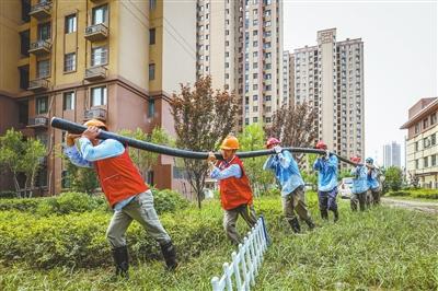 7月27日晚,在南岗嘉苑小区的应急抢险现场,国网北京海淀供电公司应急抢险队的队员们正扛着600米长、重1.8万斤的高压电缆朝着指定地方前行,并准备进行铺设。“不管怎样,今天,一定要把电供上。”海淀公司支援河南应急抢险队的刘长江正一边指挥,一边告诉大家。由于电缆长度长,又很重,在现场,很多居民都主动加入了扛电缆的队伍中。