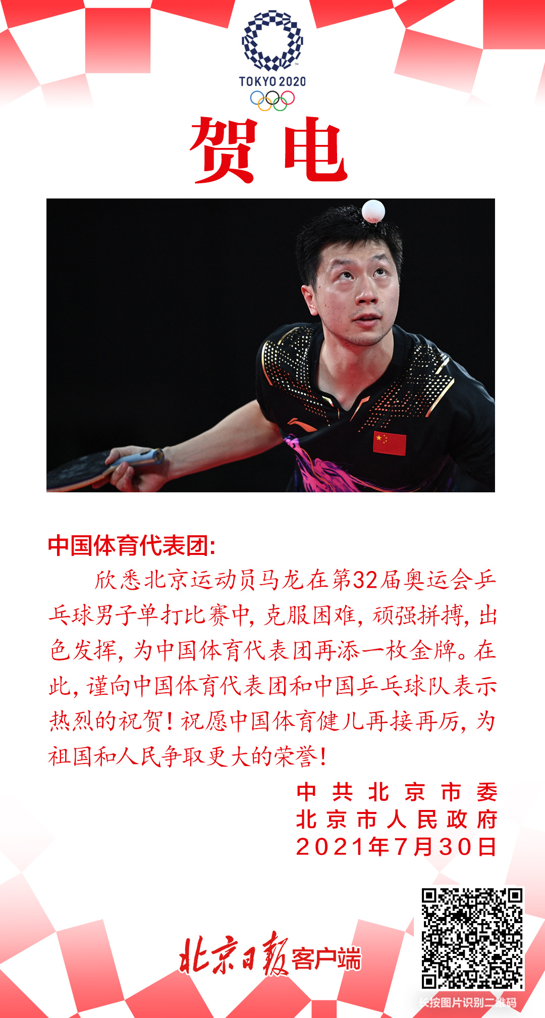 祝贺!北京运动员马龙获得金牌,北京市委市政府发来贺电