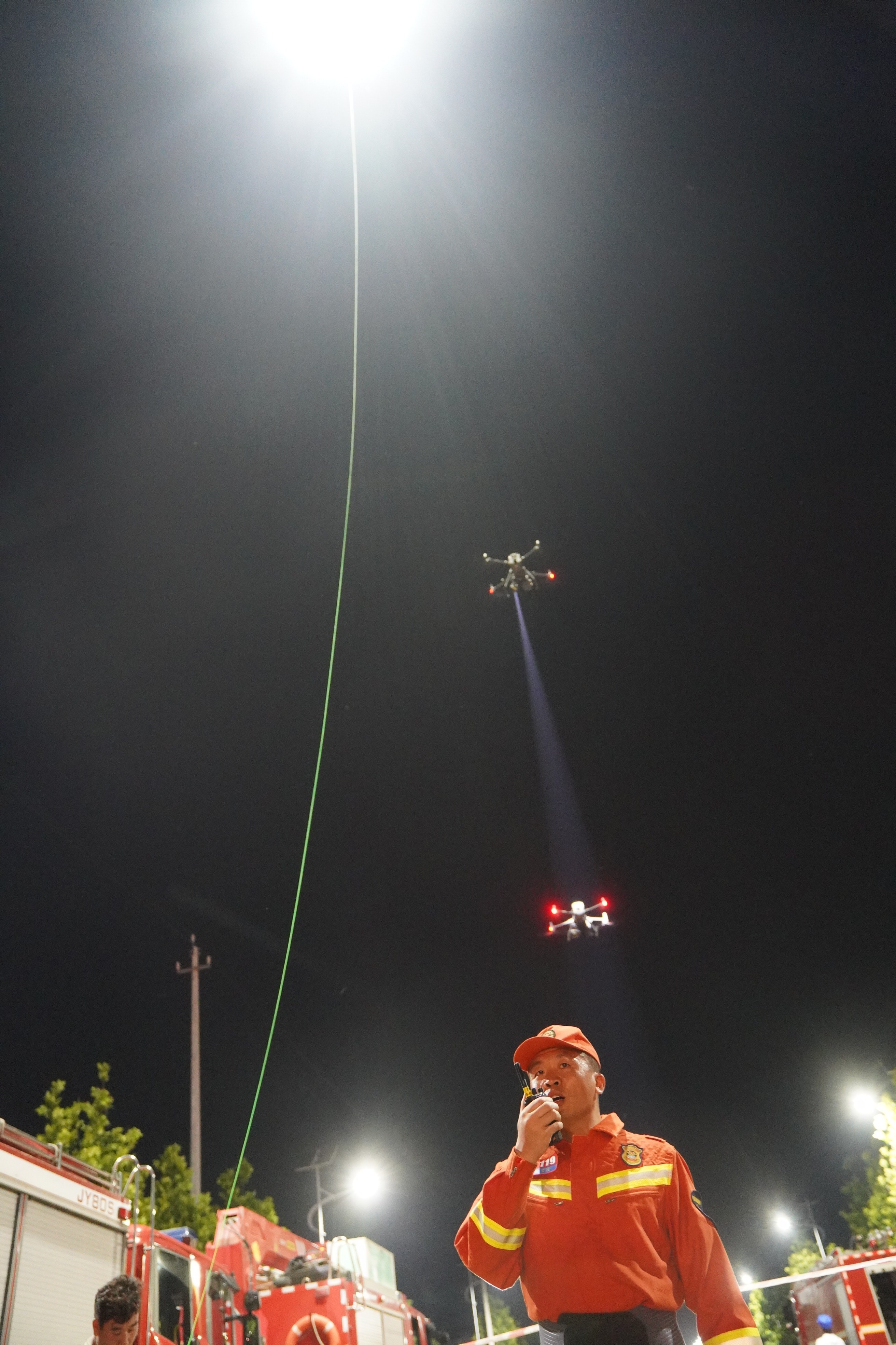 7月25日下午,前方突然传来紧急通知,新乡市卫辉市宝塔东路有大量被困人员,由于当时临近晚上,天色逐渐黑暗,应急通信分队立即将续航、滞空能力超强的“系留”照明无人机升空,为水域救援现场提供移动照明,给被救人员的心里极大的踏实感。针对夜间救援行动中舟艇,应急通信分队使用照明无人机,照亮前进的方向,有效降低了夜间行动的危险系数。