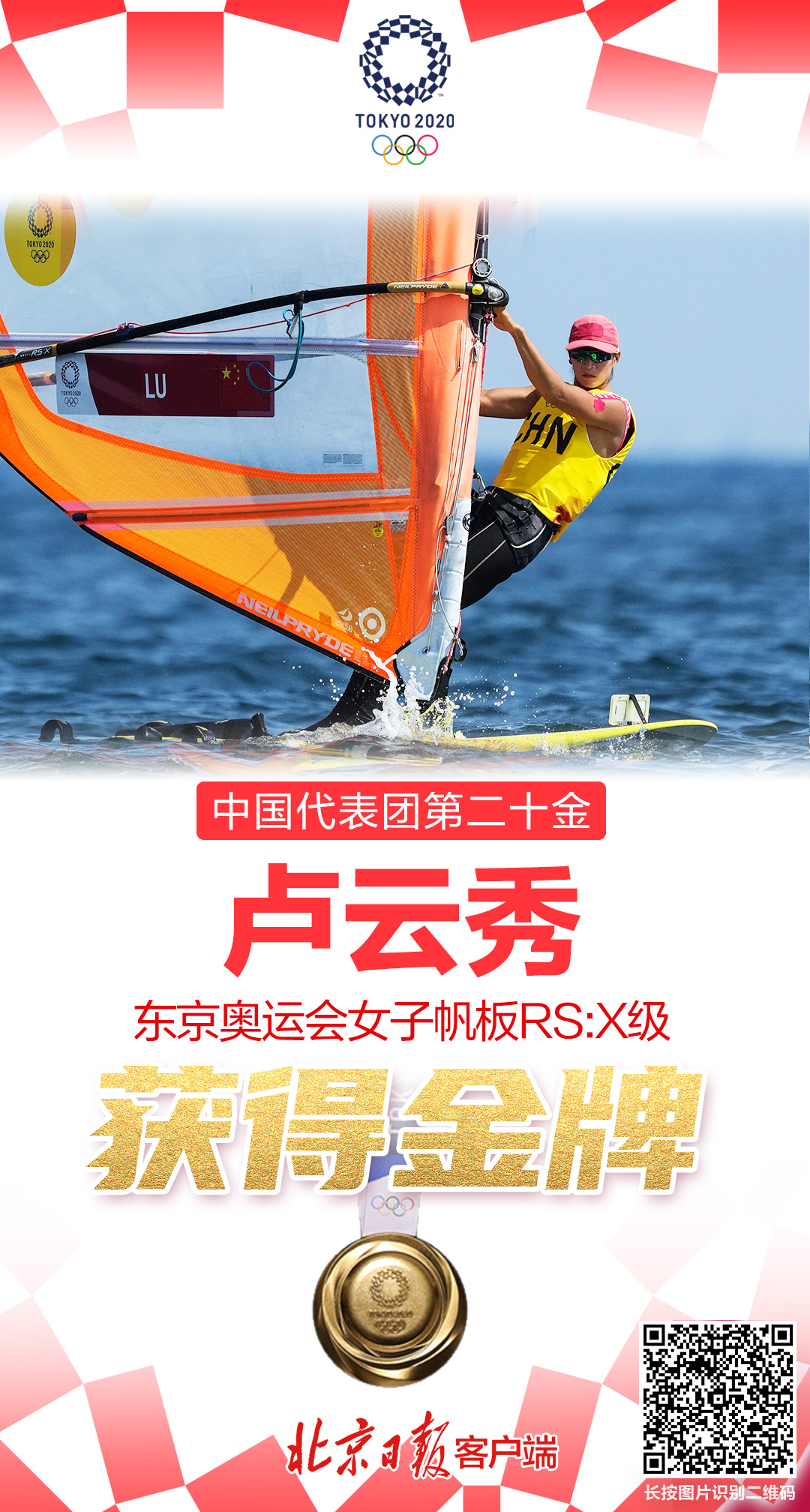 在刚刚结束的东京奥运会帆板女子RS:X级奖牌轮争夺中,中国运动员卢云秀获得第三,从而以净分36分的成绩,力压卫冕冠军法国运动员皮孔、英国运动员威尔森获得冠军。这是中国奥运代表团在奥运会史上夺得的第二枚帆板金牌。