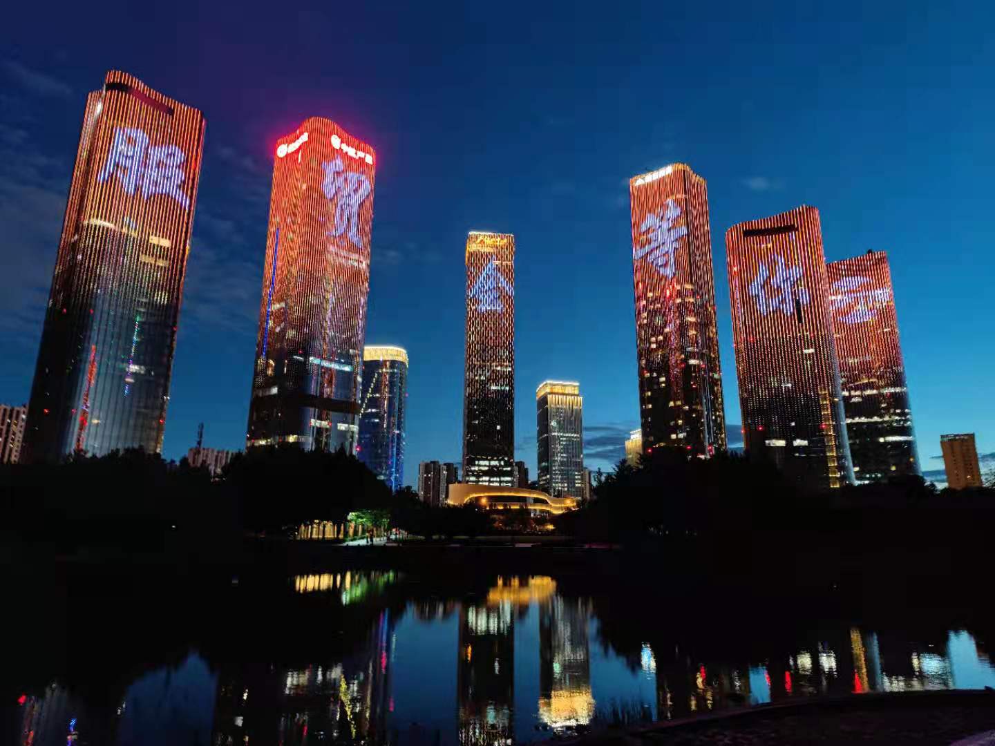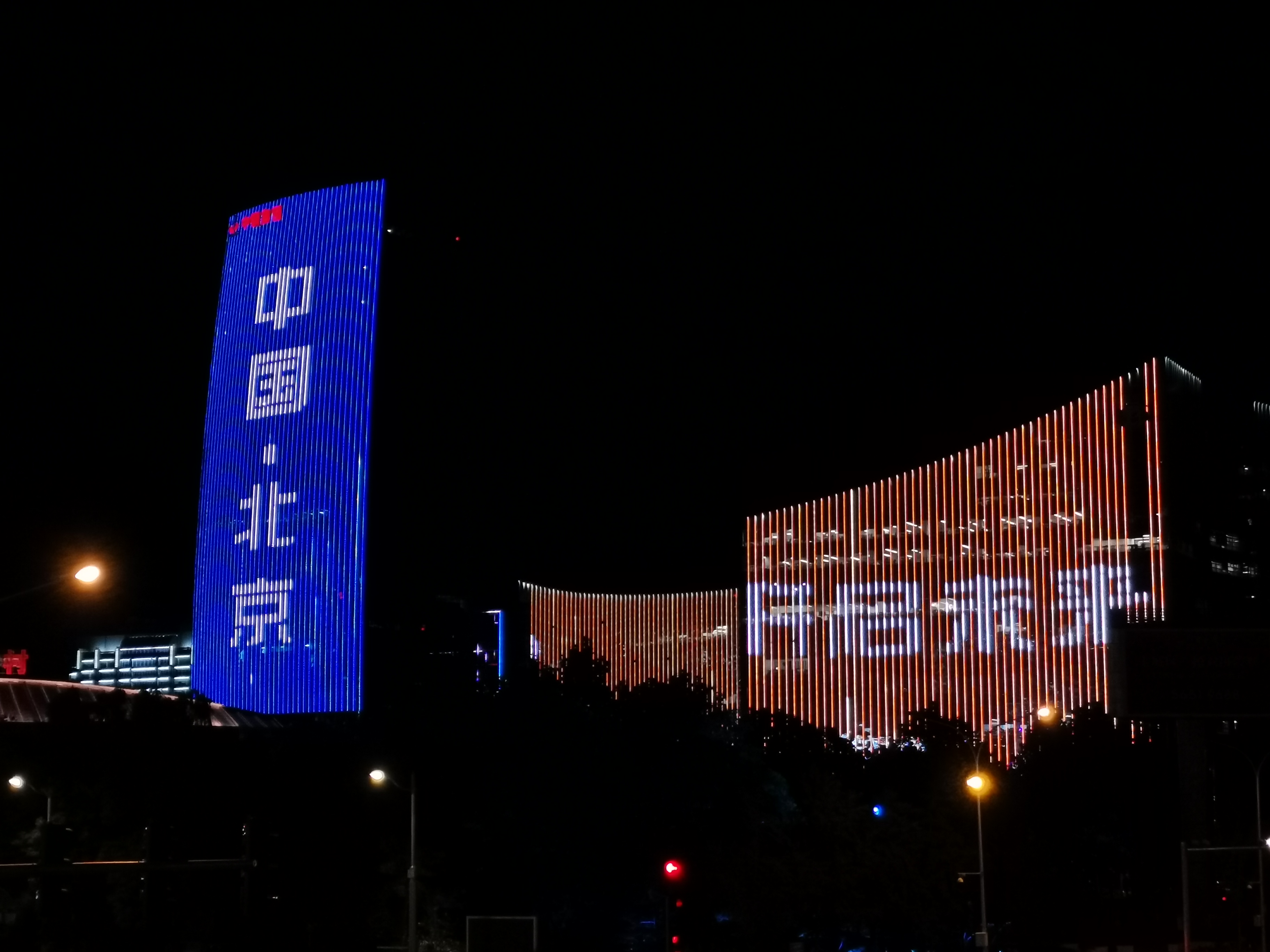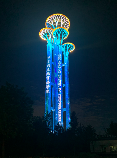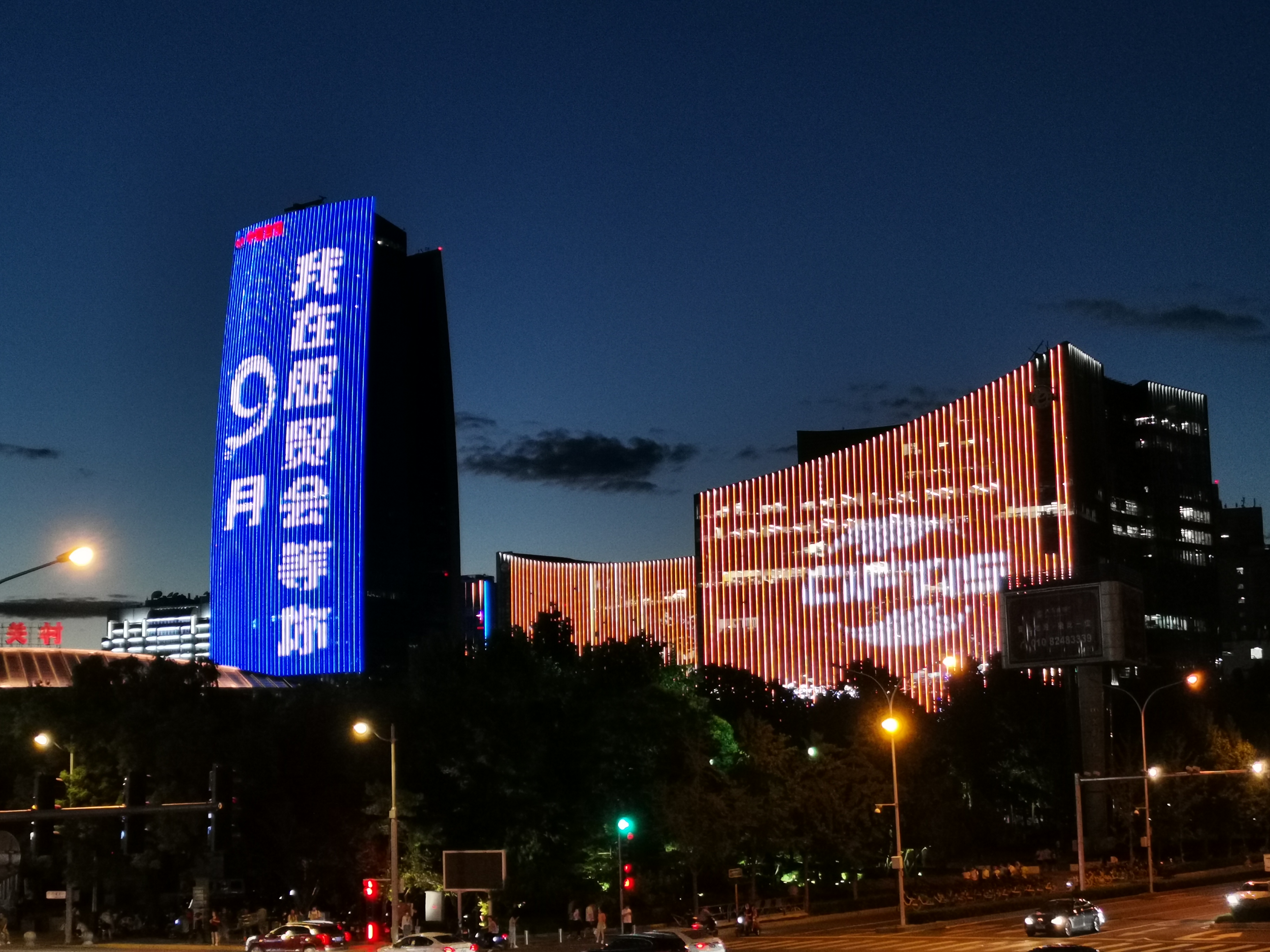在蓝岛大厦、望京社区楼体、奥林匹克公园观光塔、中关村中钢大厦等户外楼宇,写有“9月,我在服贸会等你”“中国·北京”等标语的灯光秀格外亮眼。