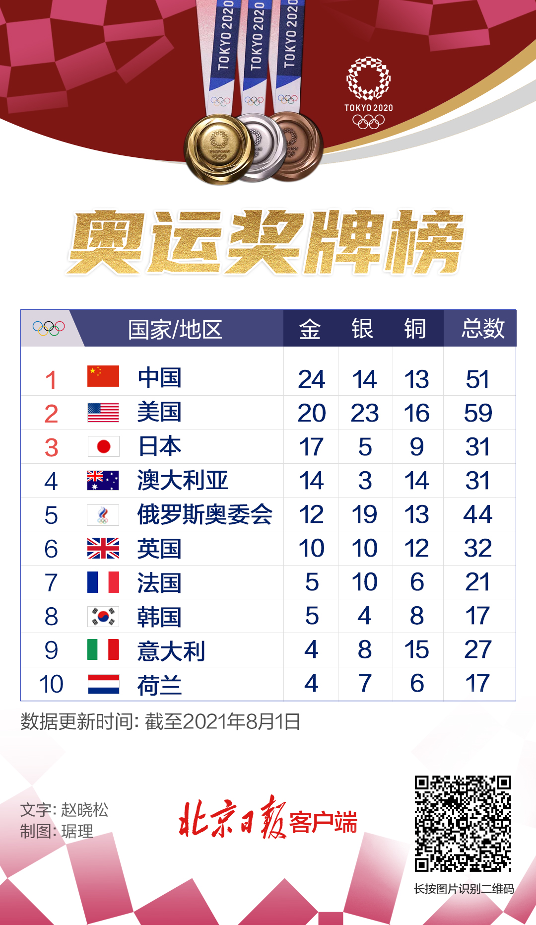 8月1日奥运奖牌榜 | 中国代表团再获三金稳居首位