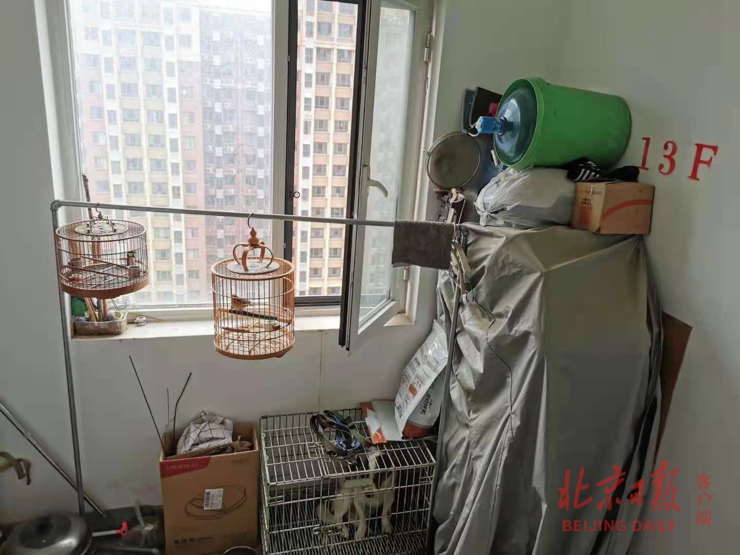 自14层下行,记者突然听到一阵鸟鸣,只见13层楼道的转弯平台上摆着一个破损衣柜,铁架上挂着几个大大小小的鸟笼,几只笼子空着,另外几只笼内,几只小鸟正“啾啾”叫着,在笼内蹦来蹦去。鸟笼下还放着一只大铁笼,笼内关着一条狗。9层平台上也琳琅满目摞满了约10个鸟笼,有的笼内还养着鹦鹉。楼道被居民当成了宠物房。