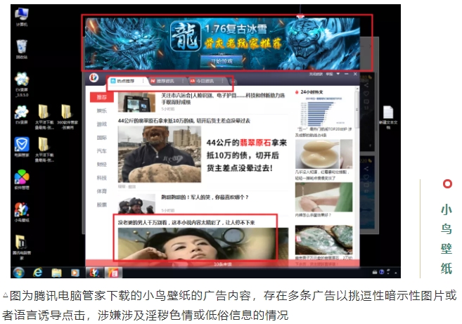 不仅如此,网络弹窗还存在内容违法情况,涉及虚假宣传、色情低俗等。调查显示,暴风影影、360安全浏览器、360安全卫士、小鸟壁纸等4款软件存在网络弹窗内容违法现象,并涉嫌存在传播淫秽色情及低俗信息等问题,以及存在以挑逗性暗示性图片或语言诱导网民点击,推广不明网站的情况。