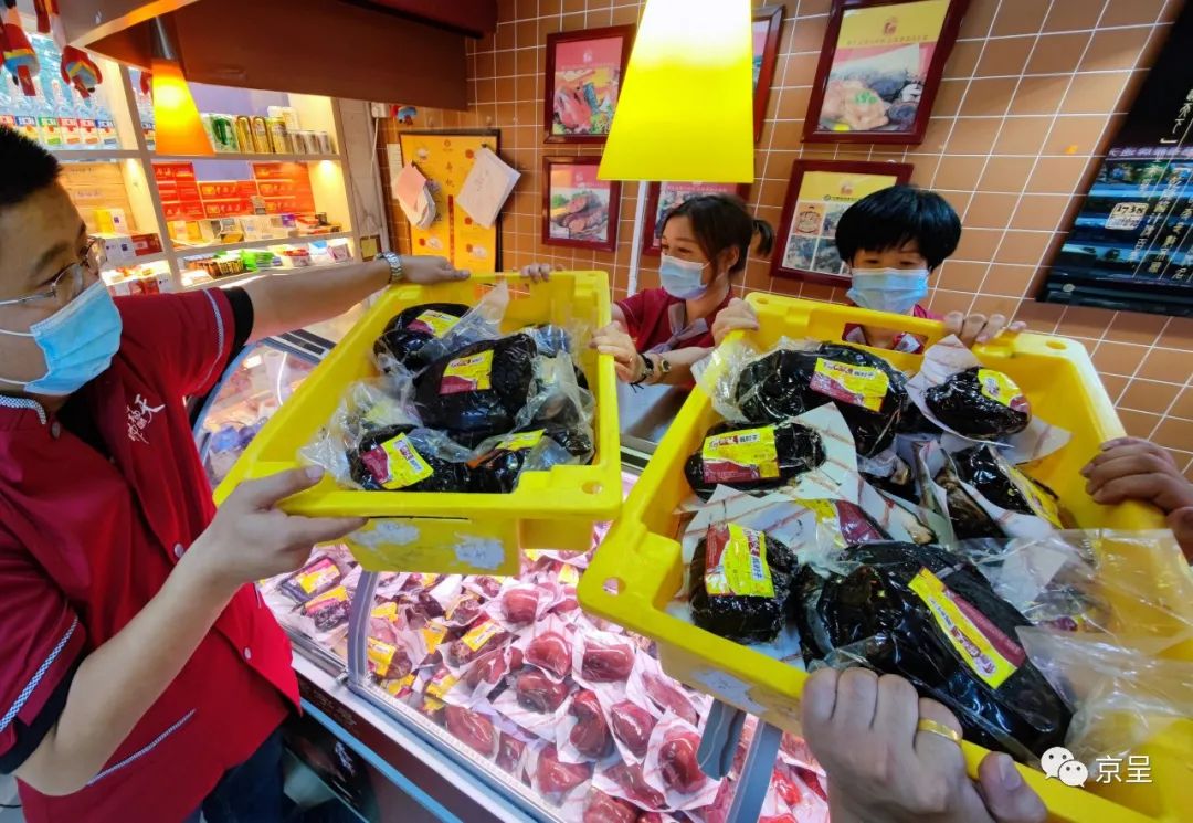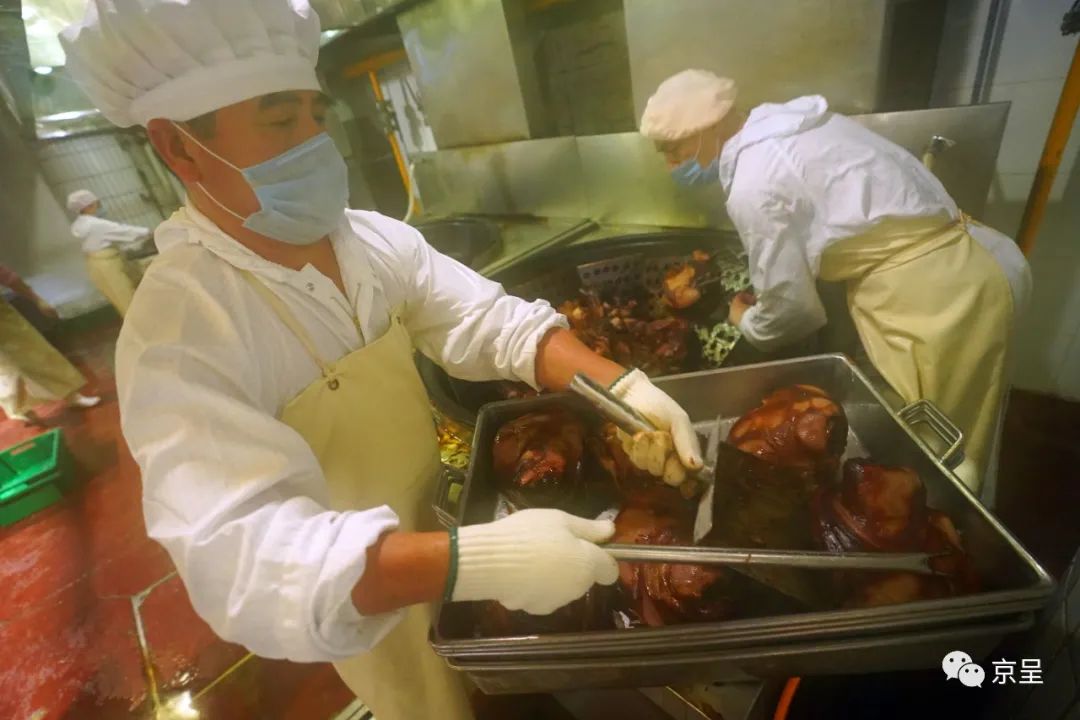 一进车间,所见天福号的师傅们早已上下开足了马力,为了保供,车间24小时轮流加班。已经为立秋准备了近80吨酱肉,以此缓解各个门店供不应求的情况。