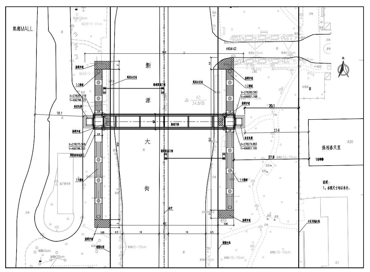 拟建天桥项目位于天宫院地铁站北侧,凯德MALL商场东侧,保利春天里小区西侧,上跨新源大街(思邈路-华佗路)路段。天桥主桥采用一跨过街设计,主桥跨径为45米,全长(含电梯)58.9米,桥面总宽5.7米,桥下净高不小于5米。梯道宽2.9米,分为1:2及1:4两种坡度,均为连续钢箱梁结构。在主通道两端设置垂直式无机房电梯,实现无障碍功能。