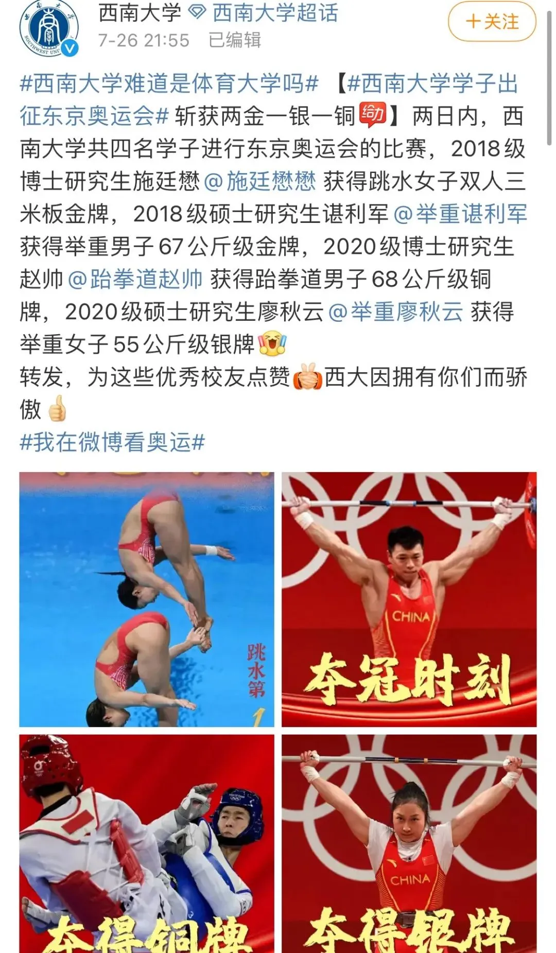 不知道各位有没有注意到,在本届奥运比赛中,有不少来自高校的奥运健儿夺得奖牌的身影。一起来看看吧!