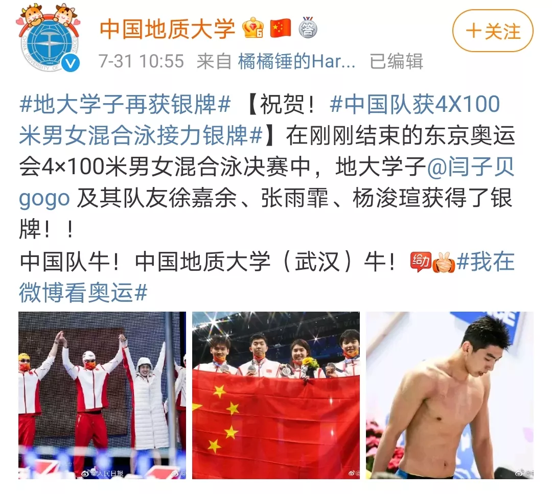 地大学子闫子贝获,4×100米男女混合泳接力银牌。