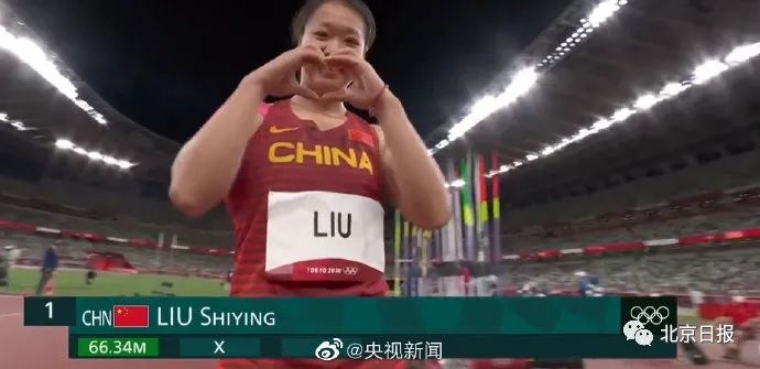 刘诗颖投出66.34米的成绩后,笑着向镜头比心