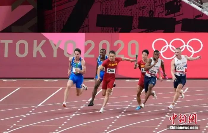 图为苏炳添(右三)给吴智强(右四)交棒。 中新社记者 杜洋 摄