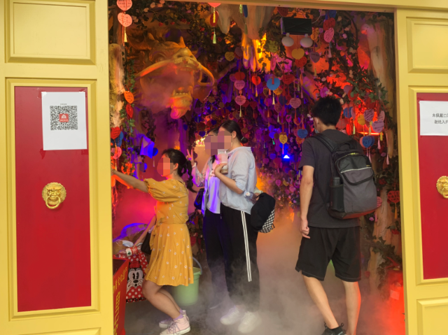 在店内一层的“网红楼梯”处,一名家长带着两个孩子也在拍照打卡,拍完照后,两个孩子凑到家长跟前一起看照片。之后,这名家长又带孩子寻找下一个打卡点,在这个过程中,家长和孩子们全程未佩戴口罩。而在店内的一处休息区,一名家长的口罩挂在手臂上,正和同样没戴口罩的孩子一起吃东西。