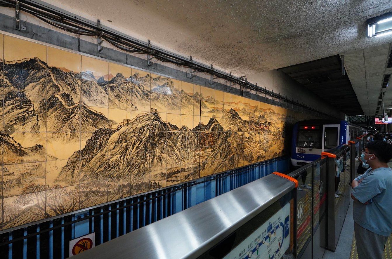 长城矗立在绵延的山脊之上,苍山翠松,巨石飞瀑,大雁凌空;长城脚下,还有星星点点的民居……在地铁2号线西直门站和东四十条站站台,原本破损掉色的壁画,现在又恢复了历史原貌。