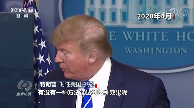 时任美国总统 特朗普:我看到消毒剂在一分钟内就把病毒消灭了,就一分钟,有没有一种方法能达到这种效果呢?比如通过体内注射或者类似清洗的方式。