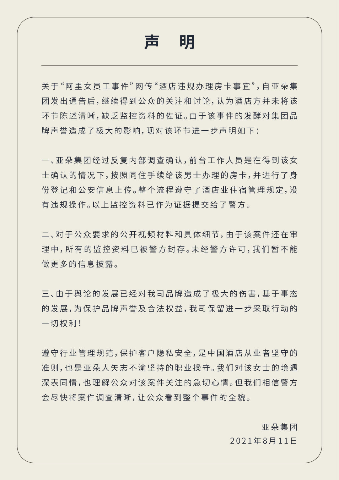 关于“阿里女员工事件”网传“酒店违规办理房卡事宜”,亚朵集团经过反复内部调查确认,前台工作人员是在得到该女士确认的情况下,按照同住手续给该男士办理的房卡,并进行了身份登记和公安信息上传。