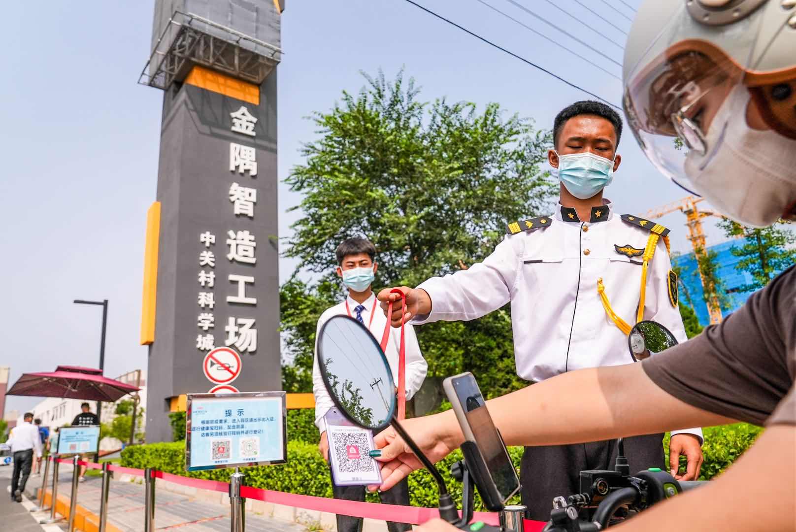 在金隅智造工场,工作人员对进入园区的人员与车辆,严格落实测温扫码登记等防控措施。