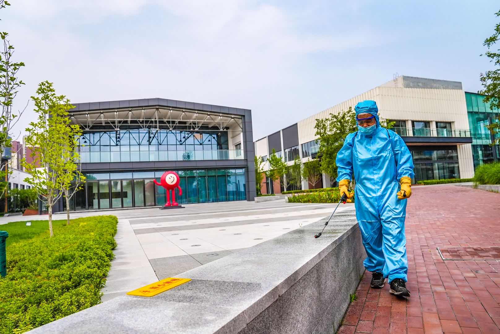 偌大的园区内随处可见防疫工作的细节:乘坐电梯时,大堂安保人员协助客户刷卡乘梯,限制4人一梯;三名专职防疫消杀工作人员身着防护服,实行轮班制全天候消杀作业,园区内每一处死角都不放过;保洁人员针对重点区域的消杀频次加密为每小时一次,包括电梯、楼道、卫生间等场所和门把手、电梯按键、楼梯扶手等部位。