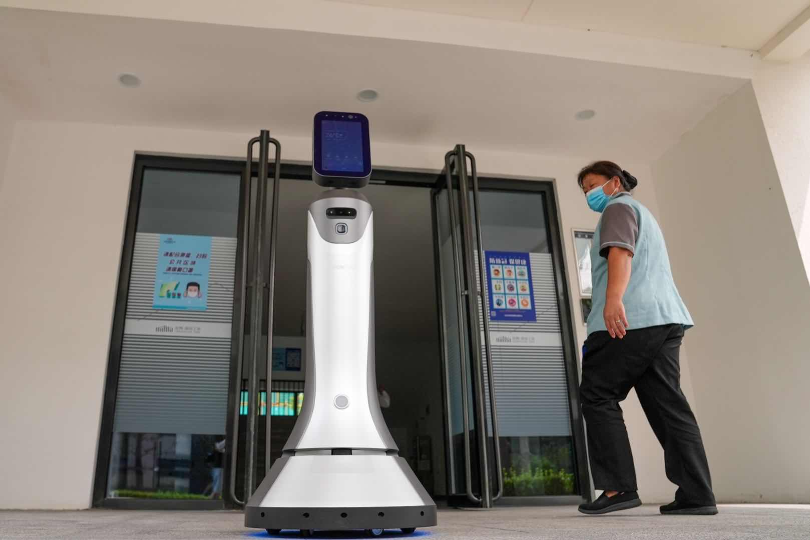 在金隅智造工场,移动机器人可对未戴口罩的人员进行提醒。