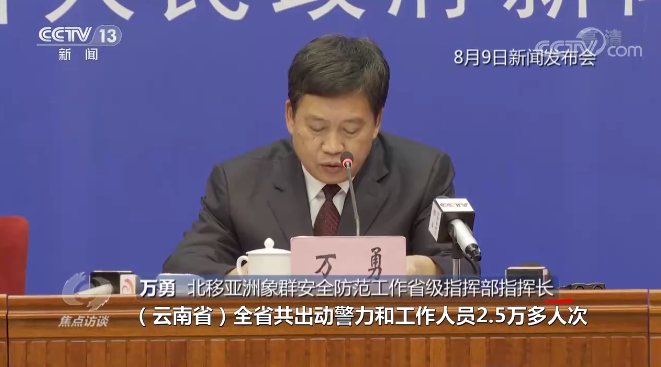 北移亚洲象群安全防范工作省级指挥部指挥长 万勇:“截至8月8日,云南省出动警力和工作人员2.5万多人次,疏散转移群众15万多人次,投放象食近180吨。”