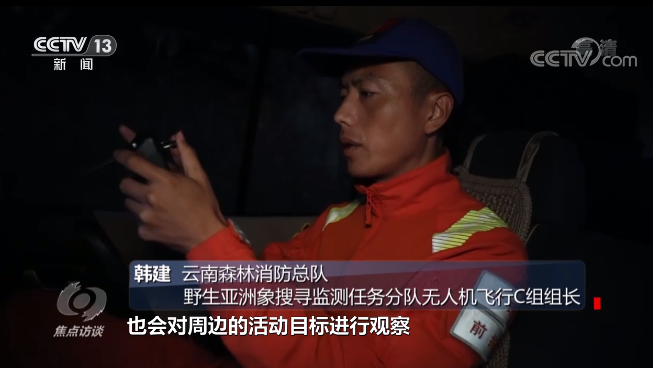 云南省森林消防总队野生亚洲象搜寻监测分队无人机飞行C组组长 韩建:“由于象群行进的速度比较快,我们只能一边开车,一边操作无人机来进行跟踪监测,在跟踪监测象群的同时,也会对周边的活动目标进行观察,一旦发现有活动目标,我们就会启用无人机的喊话功能进行预警疏散,同时把画面回传指挥部,由指挥部协调当地干部对周围群众进行专人疏散。”
