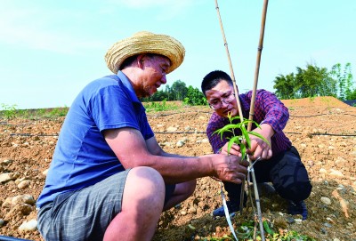 33岁的刘沈厅(右)从电子科技大学硕士毕业后,回到家乡四川省眉山市彭山区创办家庭农场,成为“新农人”。新华社发