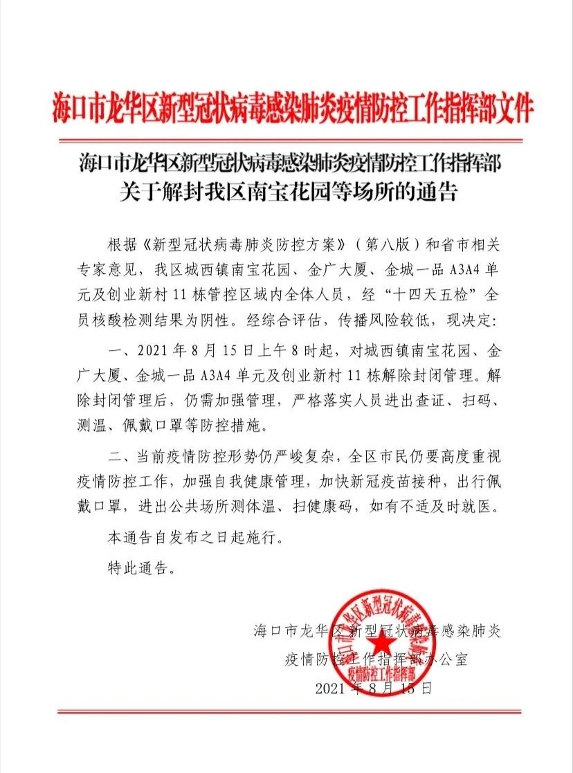 经综合评估,传播风险较低,决定2021年8月15日上午8时起,对城西镇南宝花园、金广大厦、金城一品A3A4单元、创业新村11栋、农垦二供6栋一单元解除封闭管理。