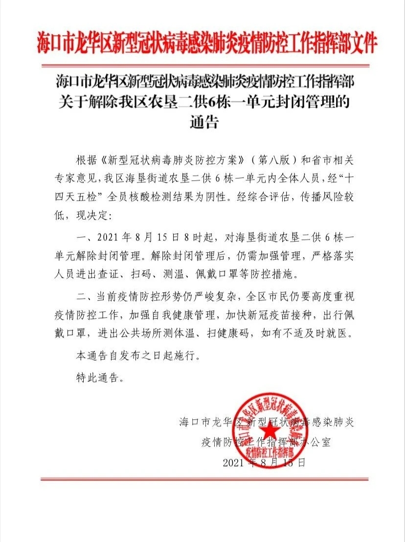 记者从海南省海口市龙华区新型冠状病毒感染肺炎疫情防控工作指挥部获悉,该区指挥部15日发布《关于解封我区南宝花园等场所的通告》《关于解封我区农垦二供6栋一单元封闭管理的通告 》称,根据《新型冠状病毒肺炎防控方案》(第八版)和省市相关专家意见,该区城西镇南宝花园、金广大厦、金城一品A3A4单元、创业新村11栋、农垦二供6栋一单元管控区域内全体人员,经“十四天五检”全员核酸检测结果为阴性。