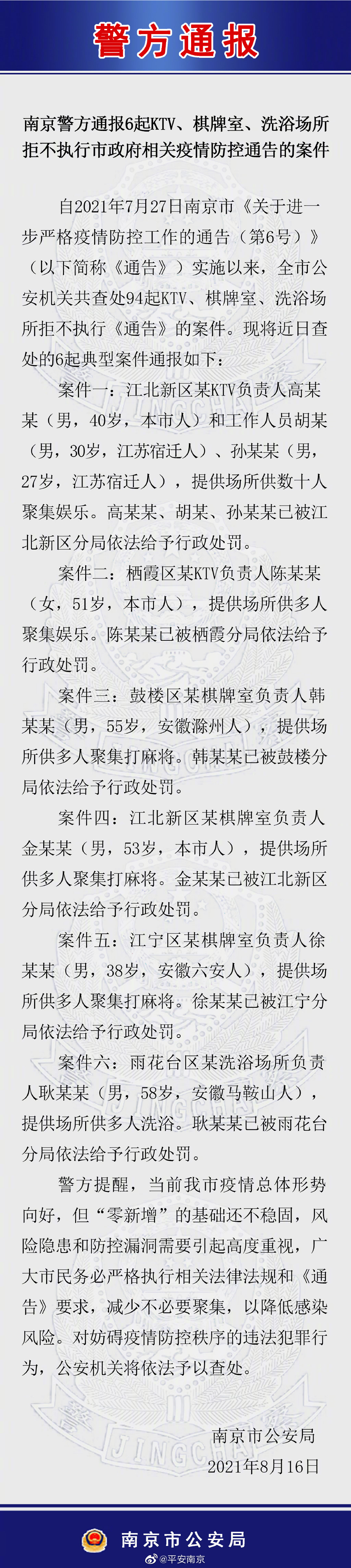 16日,南京警方通报6起KTV、棋牌室、洗浴场所拒不执行市政府相关疫情防控通告的案件。
