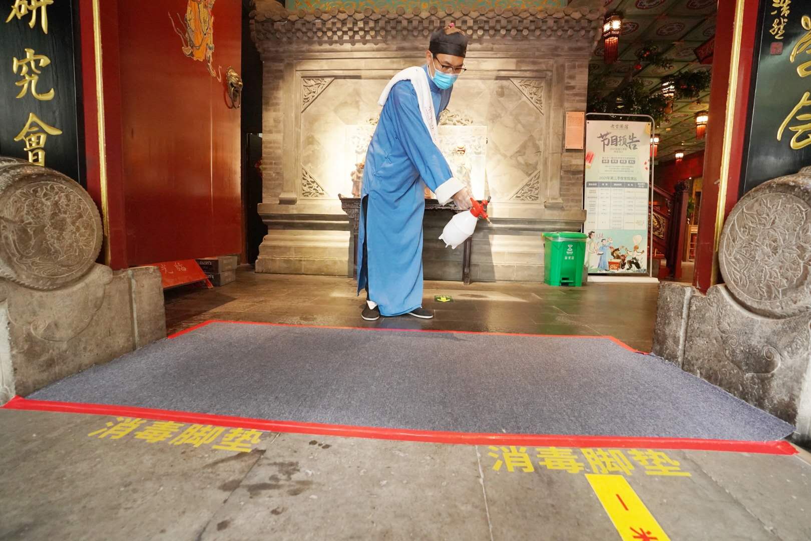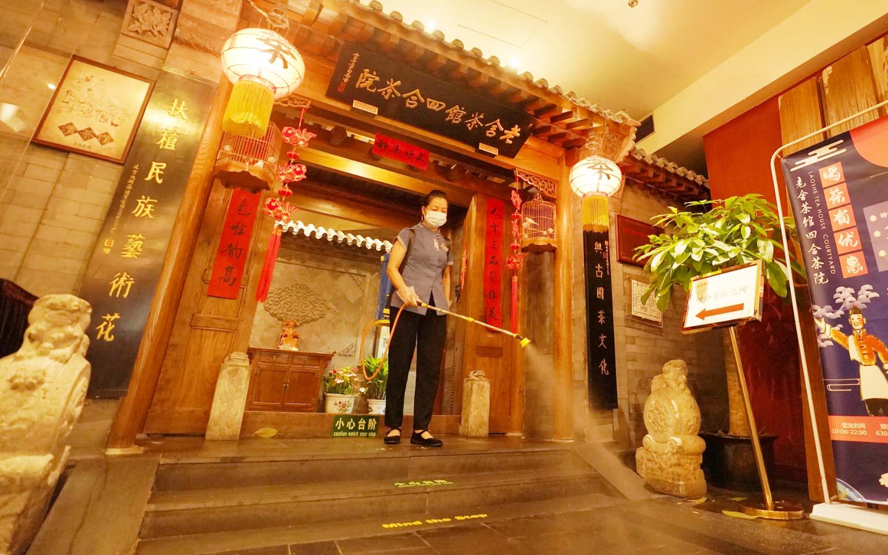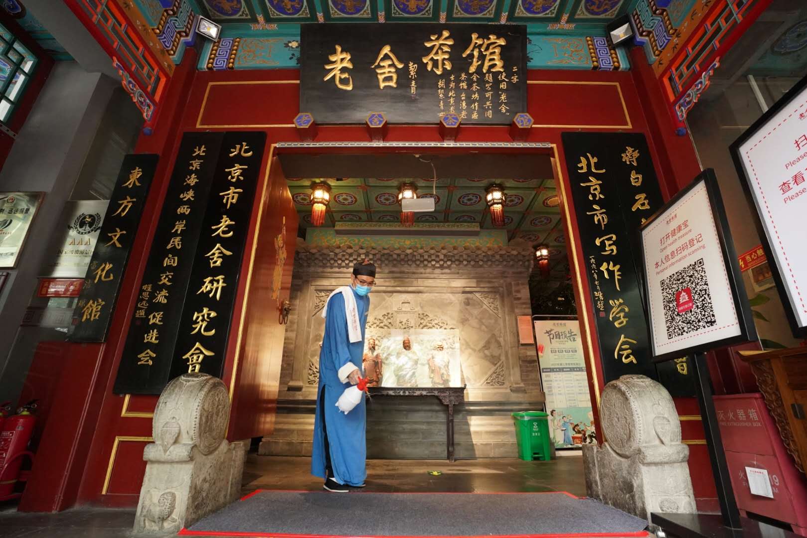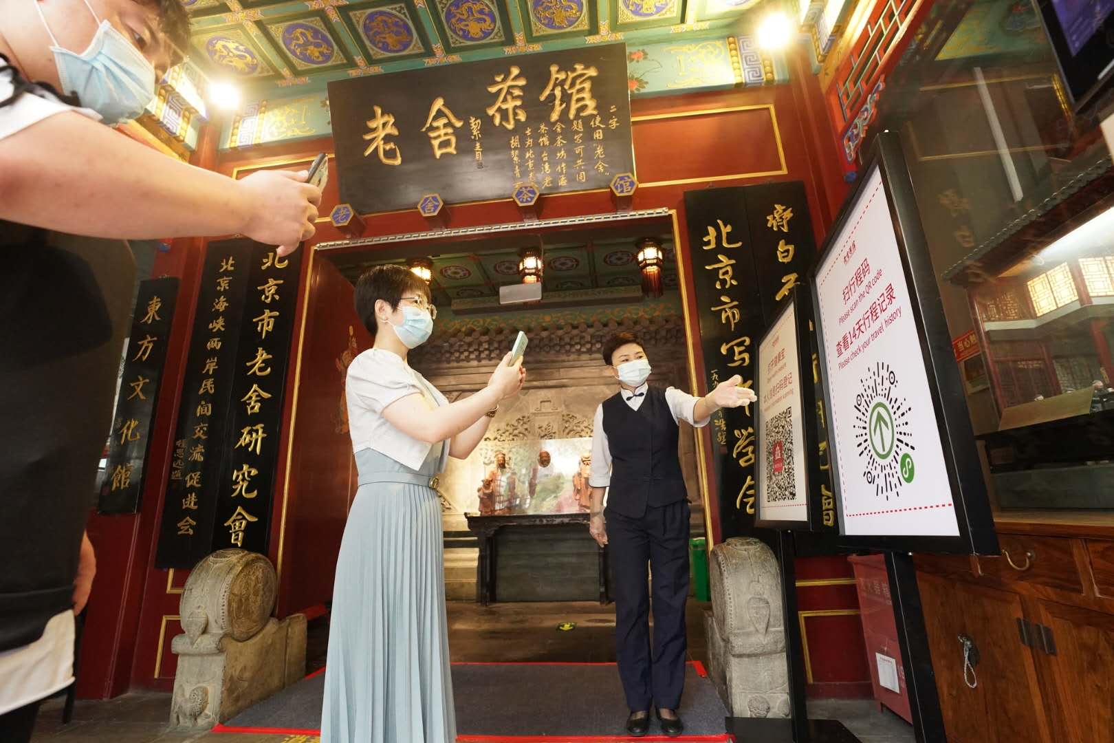 据介绍,老舍茶馆进店的游客接受体温检测、需扫描健康宝进行登记,出示14天行程码,按照要求佩戴口罩,安全检查符合要求后,方可有序进店。门口还增加消毒脚垫,为进店游客做全方位安全保障。