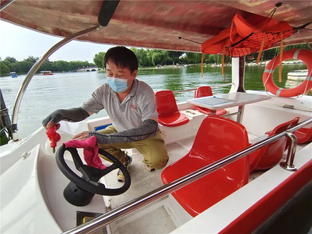 园区东码头工作人员介绍,园区一共285艘游船,游客用完游船,都会进行全面消毒,让y游客们游玩起来安心、放心。