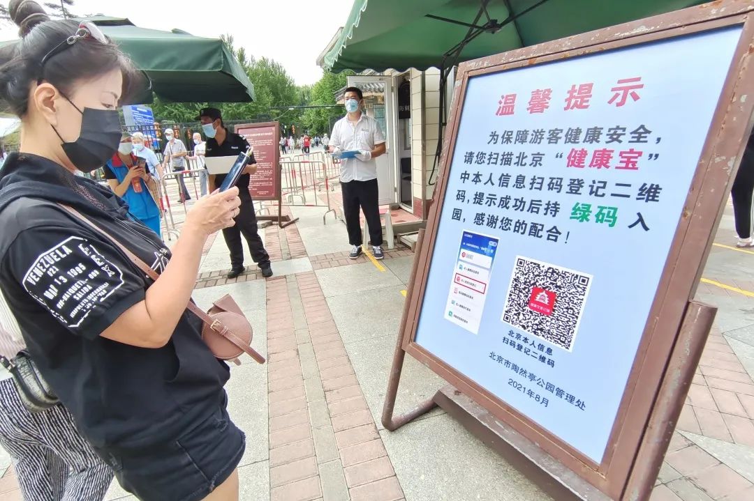 上午8时,小编来到陶然亭公园北门看到,入园的游客都能主动打开“健康码”“行程码”扫码入园,地上的“一米”线随时提醒游客要保持安全的距离。