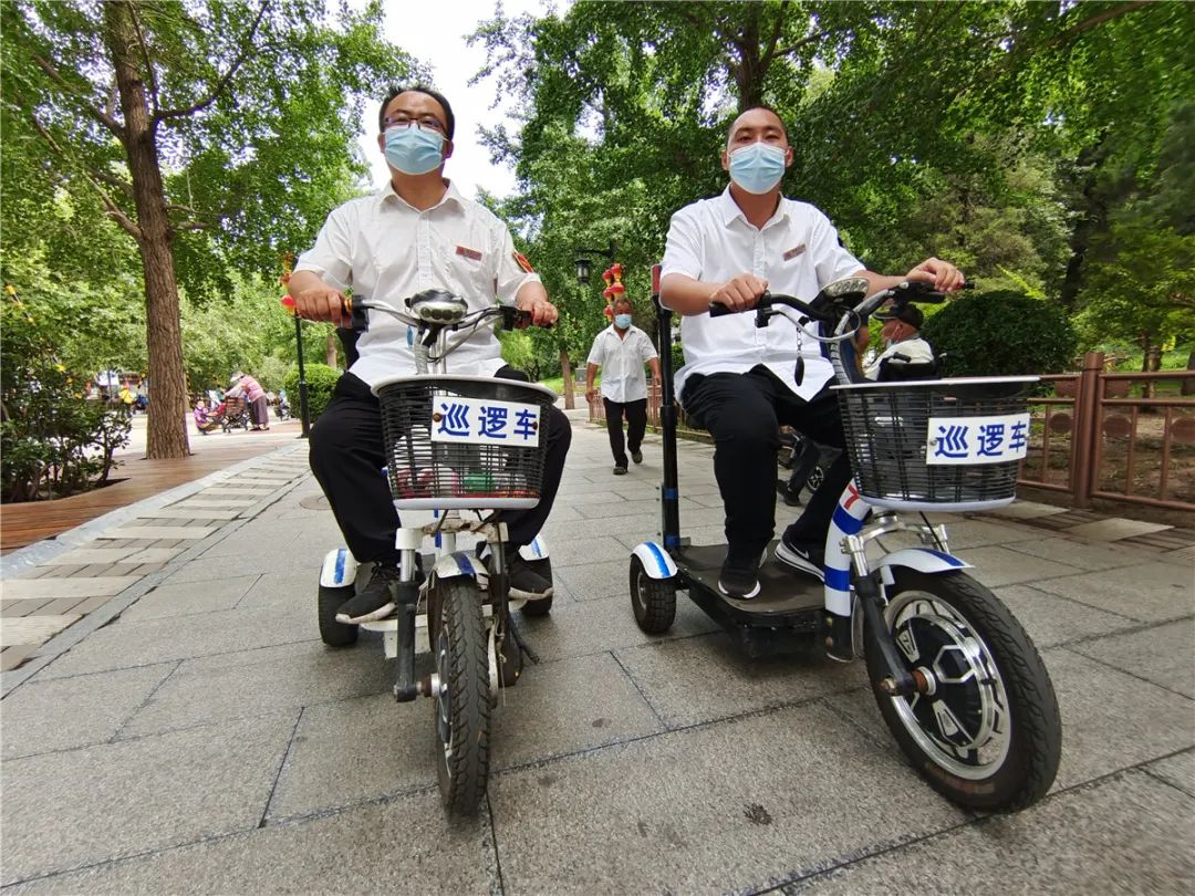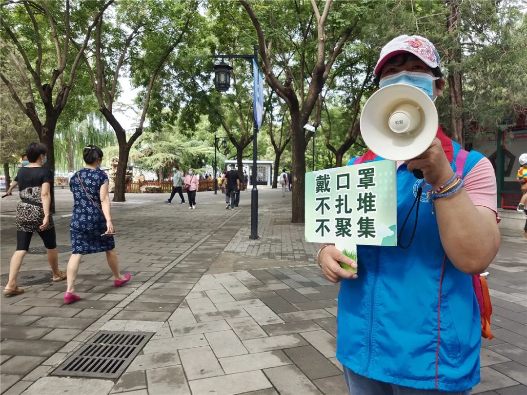 公园增派巡逻人员,加强巡逻频次,随时提醒游客“戴口罩、不扎堆、不聚集”。