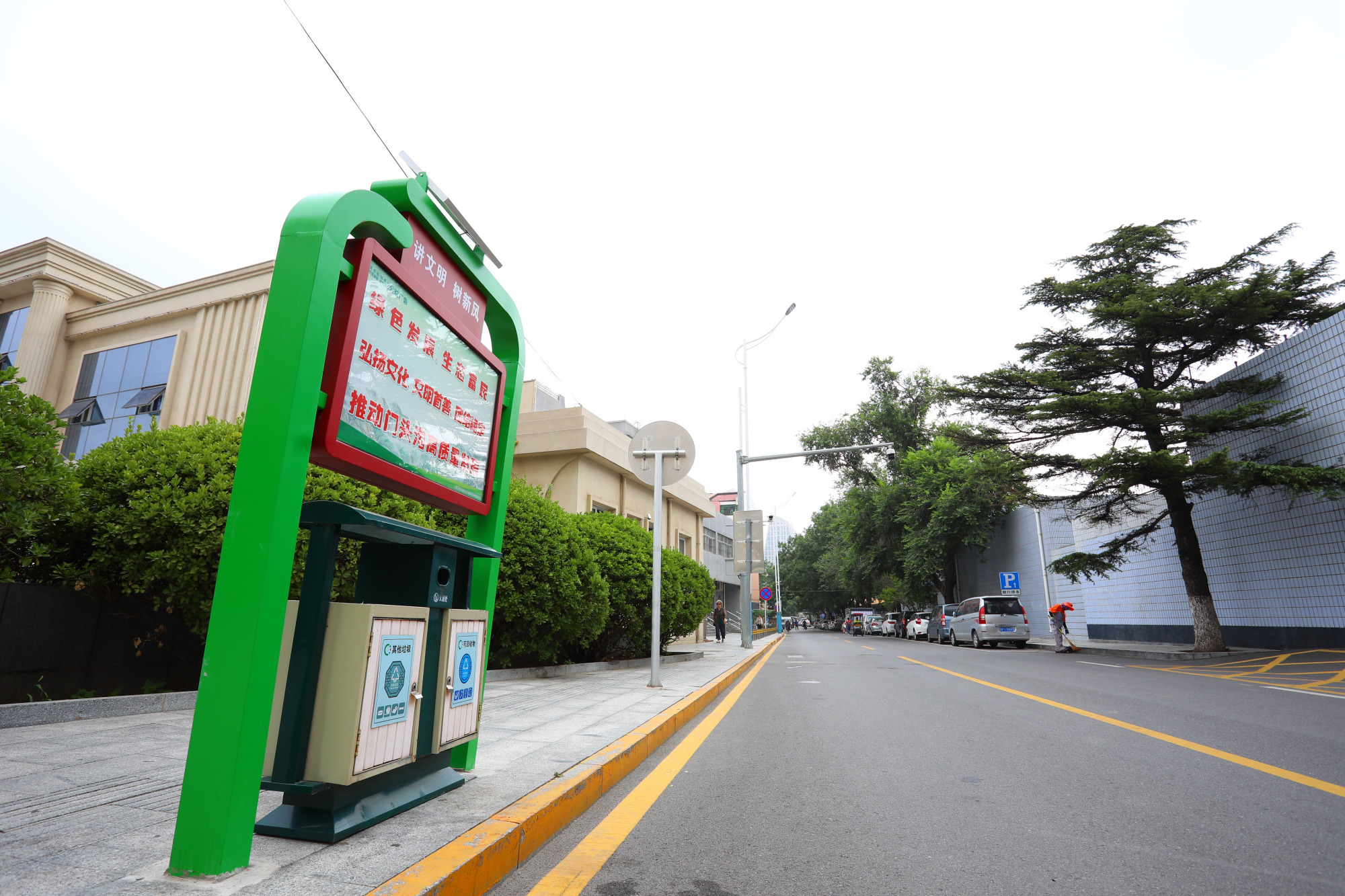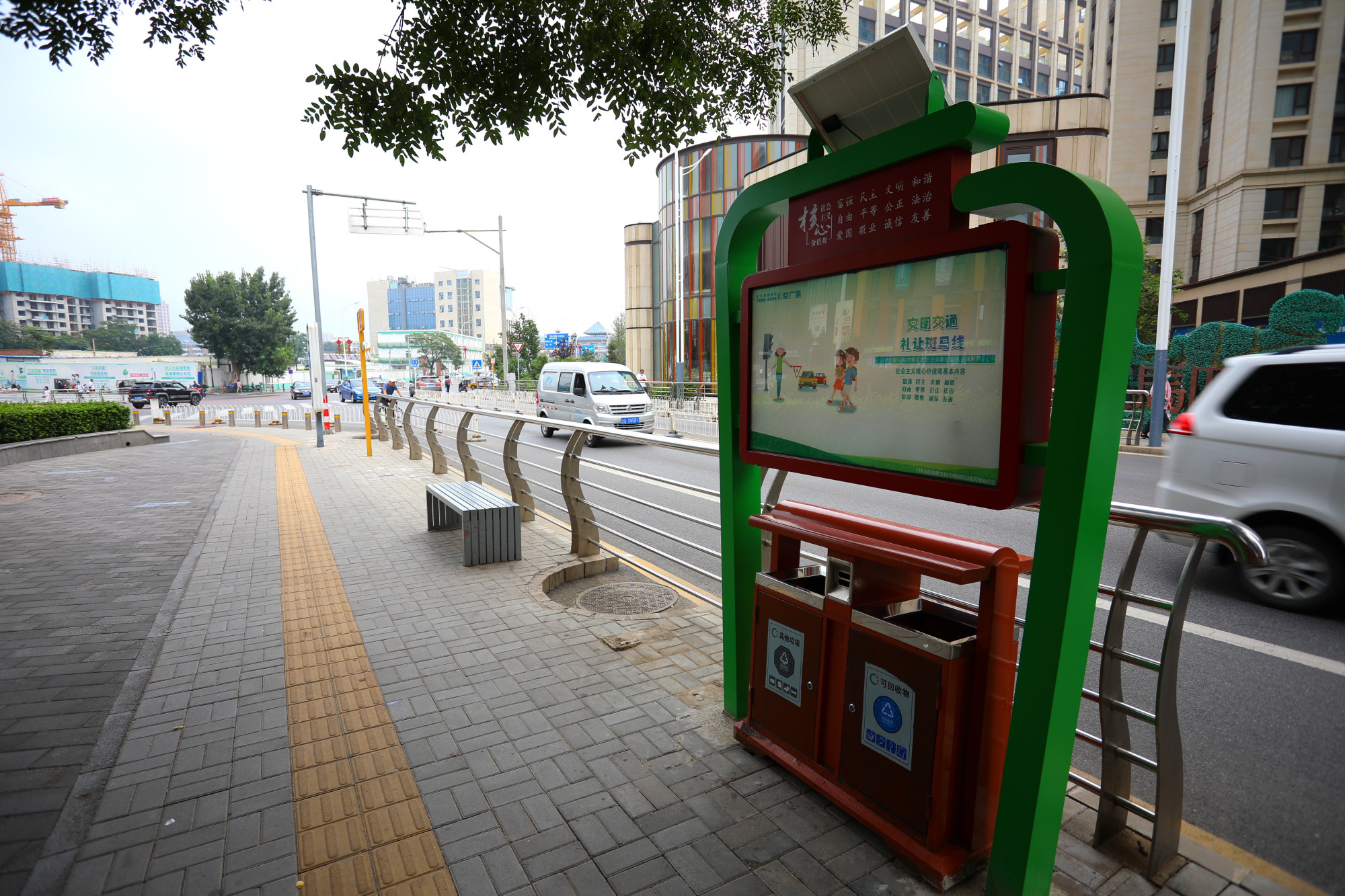 新增设的宣传栏形似门头沟的“门”字,一侧为“创城”宣传海报,另一侧是“讲奉献、争第一”、“四个一”等门头沟人耳熟能详的口号和精神,简约的设计、红绿的配色,也与“门头沟热心人”的标志相呼应,体现了我区“创城”工作的核心。宣传栏上方还架设了太阳能板,用于晚间宣传栏的照明,这种节能的方式也与老区人民“节约”的品质保持了一致。