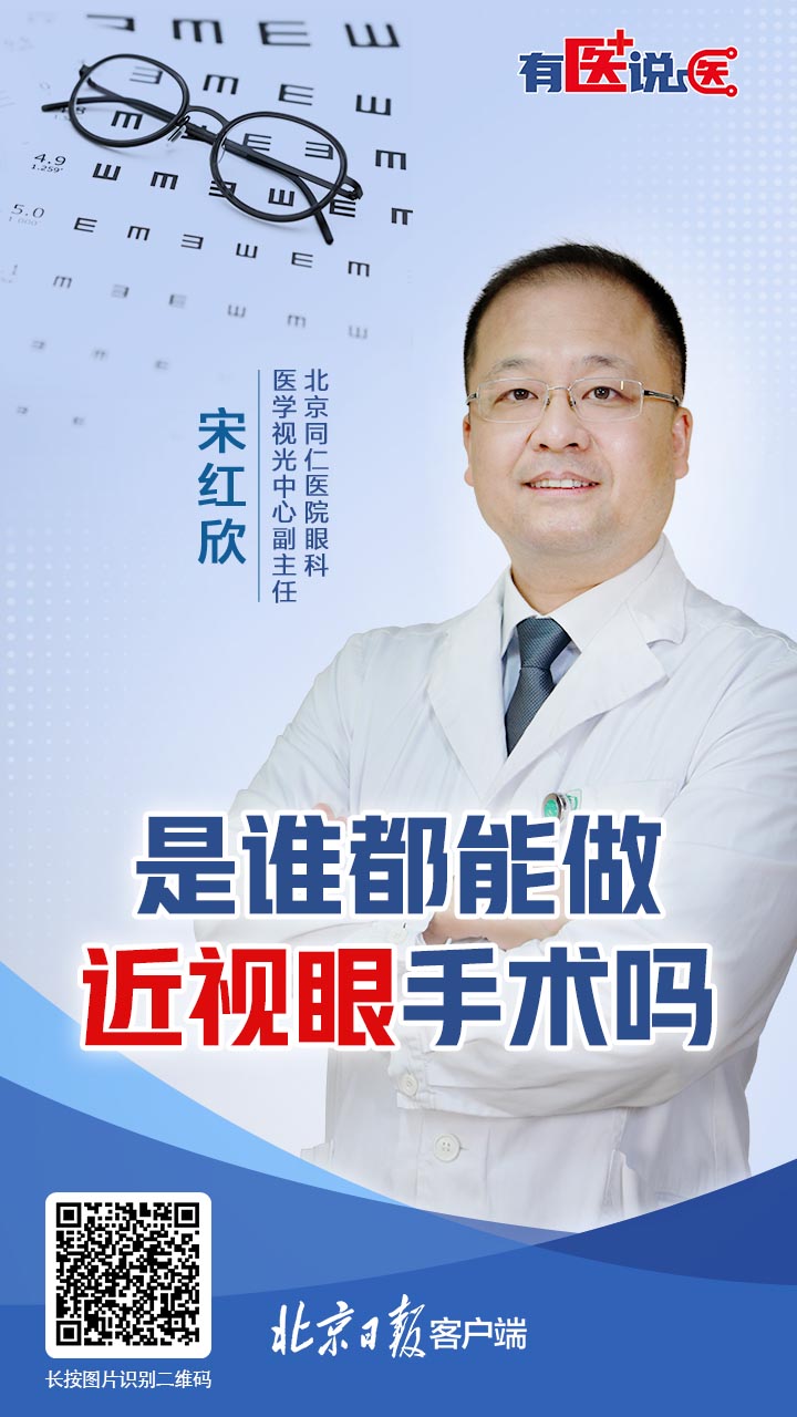 近视眼都能做摘眼镜的手术吗?北京同仁医院眼科医学视光中心副主任宋红欣:并不是所有的近视眼患者都能做近视眼手术。目前近视眼手术有两大类,一类是角膜近视眼手术,另一类是植入人工晶体手术。这两种手术到底有什么区别?您适合哪种近视眼手术?来听听宋红欣医生怎么说。